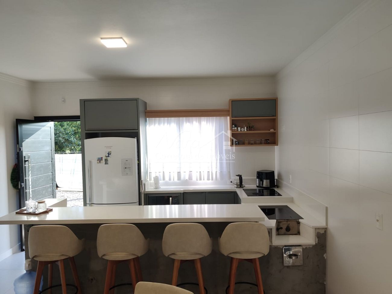 Cozinha: Mobiliário sob medida com fogão a lenha em vitrocerâmica (tecnologia e tradição).