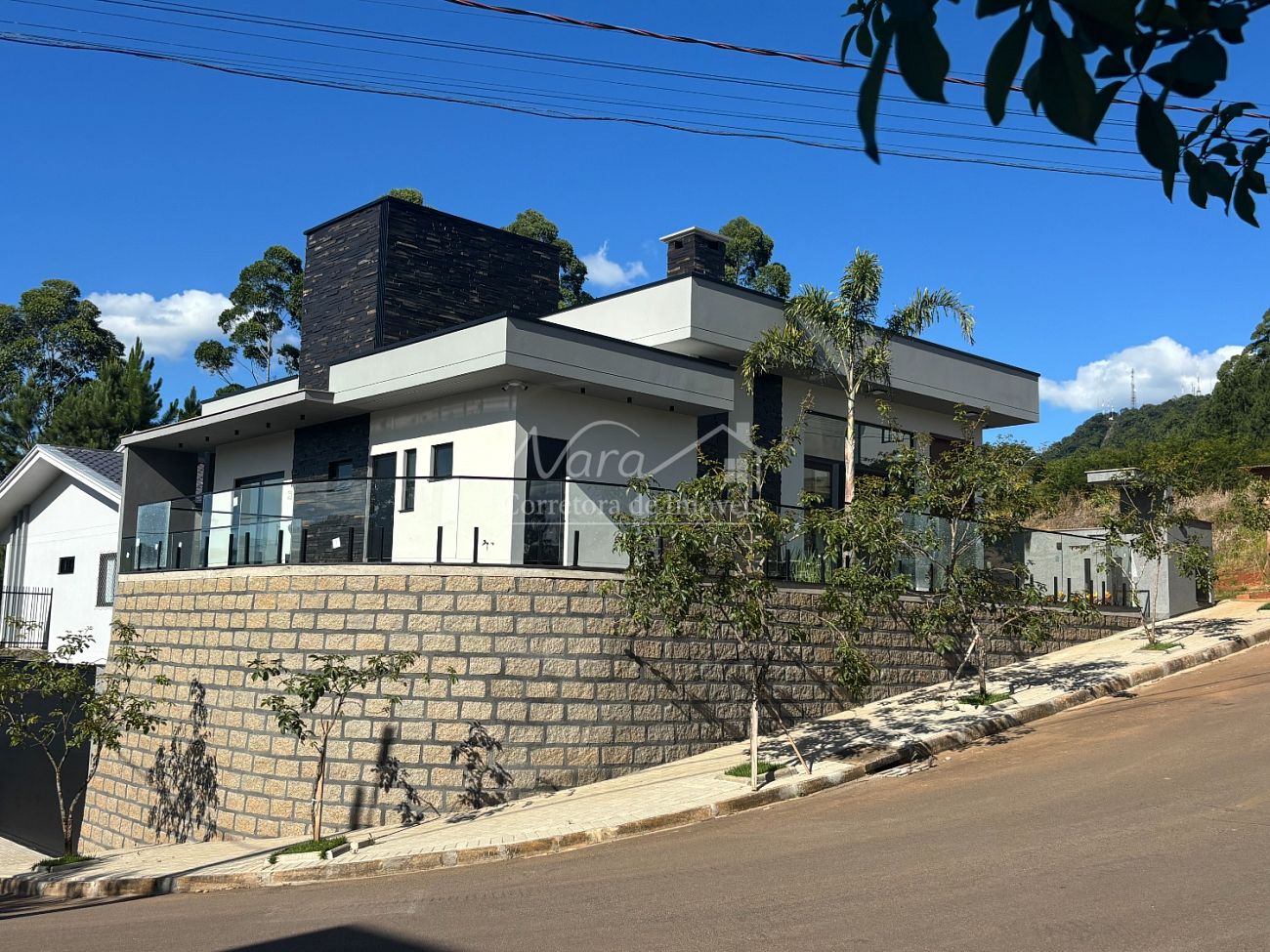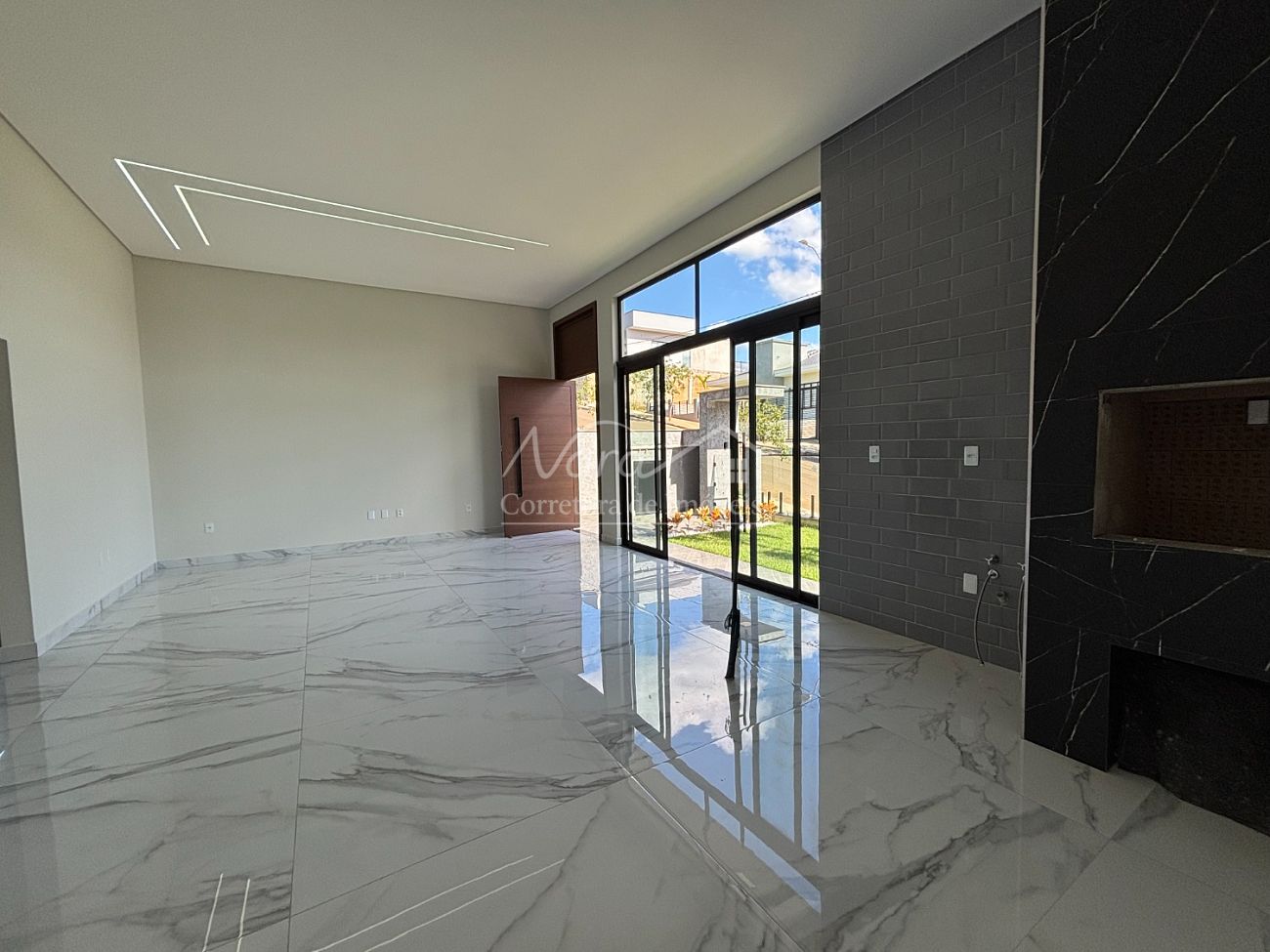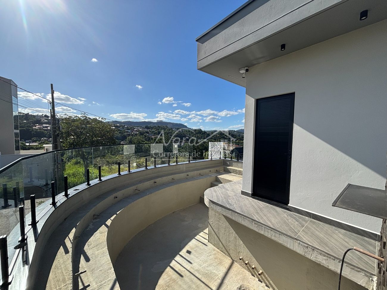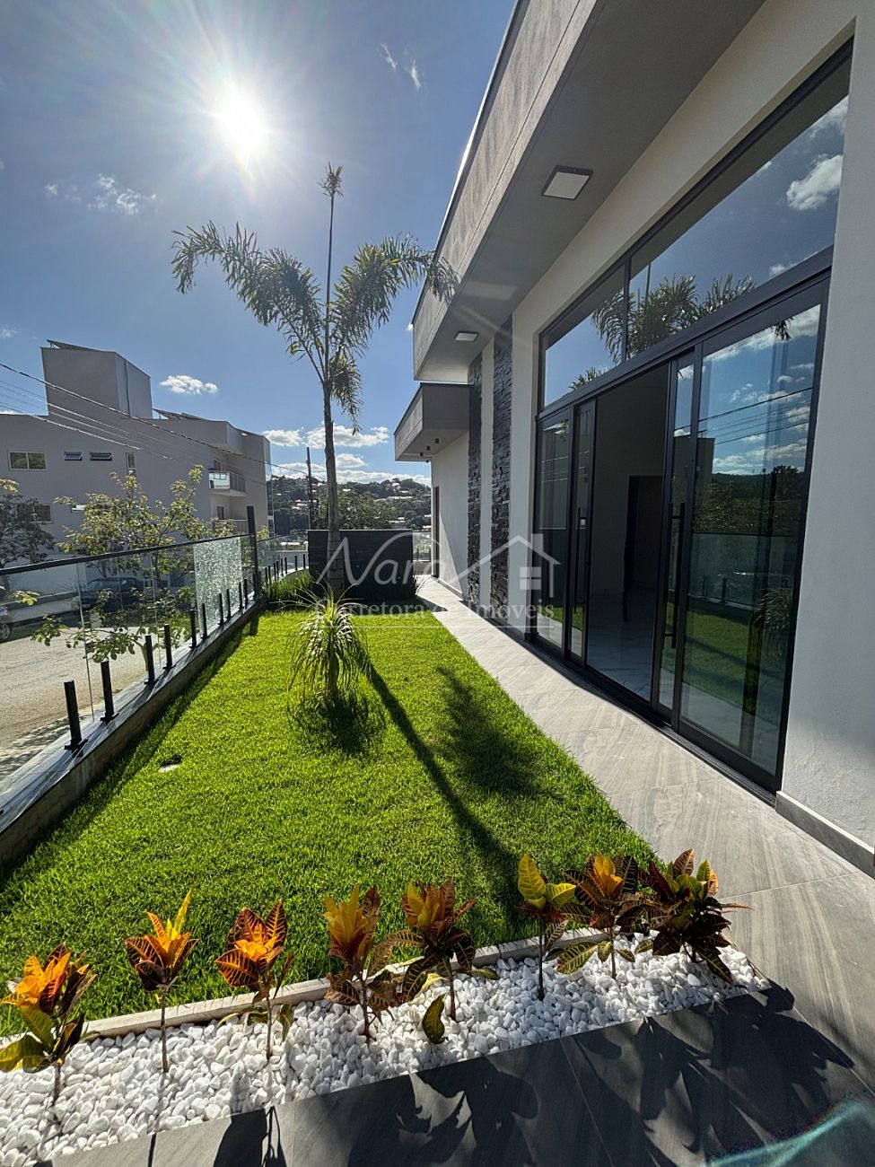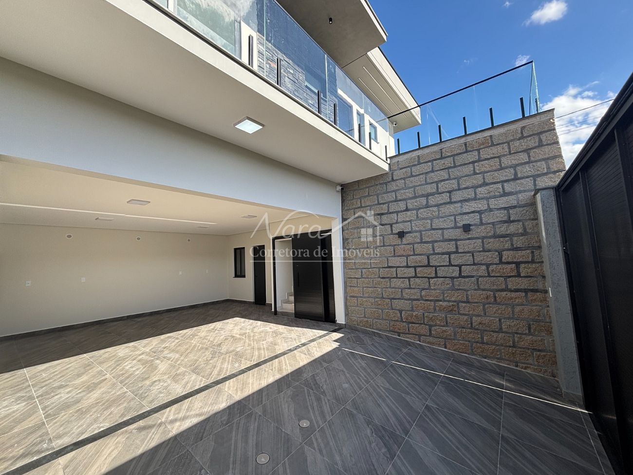 ✔️ Muro frontal com fechamento estrutural em vidro, garantindo segurança sem comprometer a estética.